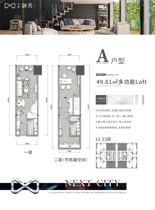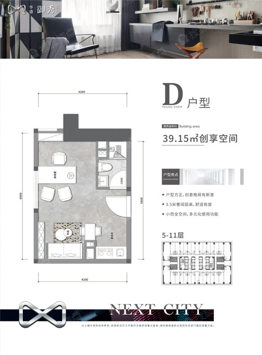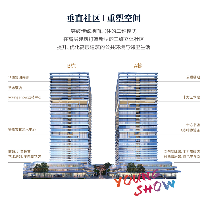 共有5栋楼,A、B栋为32层超高层办公楼,1-3层为商业(51.98-352㎡),5-11层为SOHO(39.15-145.11㎡),12-23层为LOFT(39.15-145.11㎡),25-32层为写字楼(187.68-310.44㎡)。C、D、E栋为3层独立商业(51.98-352㎡)。商铺合计179套,LOFT合计704套,SOHO合计448套,写字楼合计128套。